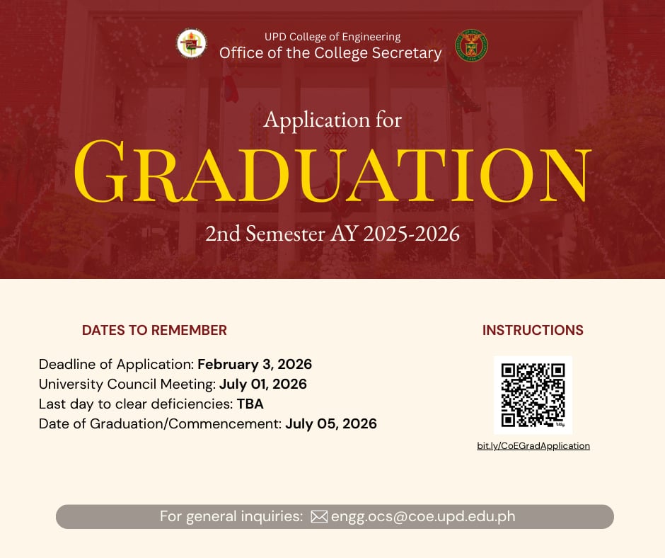 Students who are probable graduates this semester are advised to apply for graduation. For complete instructions and the list of requirements, please visit: https://bit.ly/CoEGradApplicati